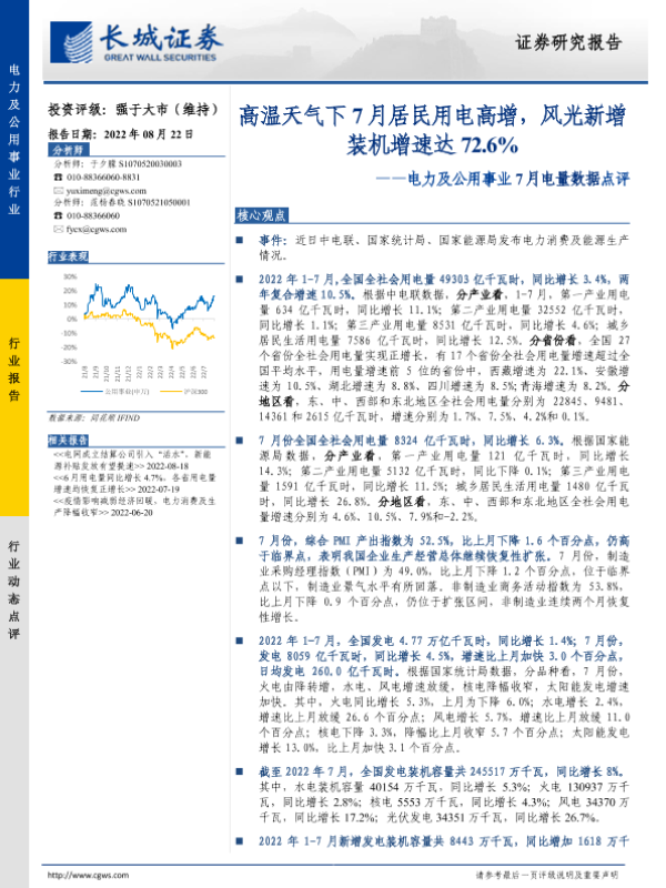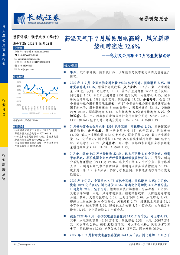 【长城证券】【20220822】7月电量数据点评:高温天气下7月居民用电高增,风光新增装机增速达72.6%-3页