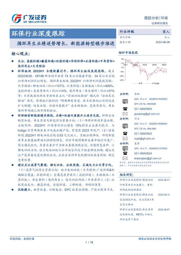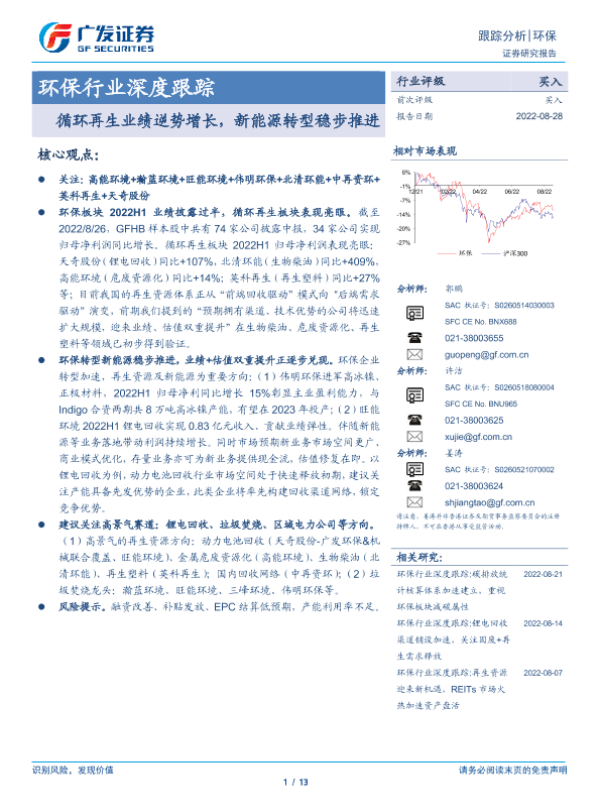 【广发证券】【20220828】环保行业深度跟踪:循环再生业绩逆势增长,新能源转型稳步推进-13页