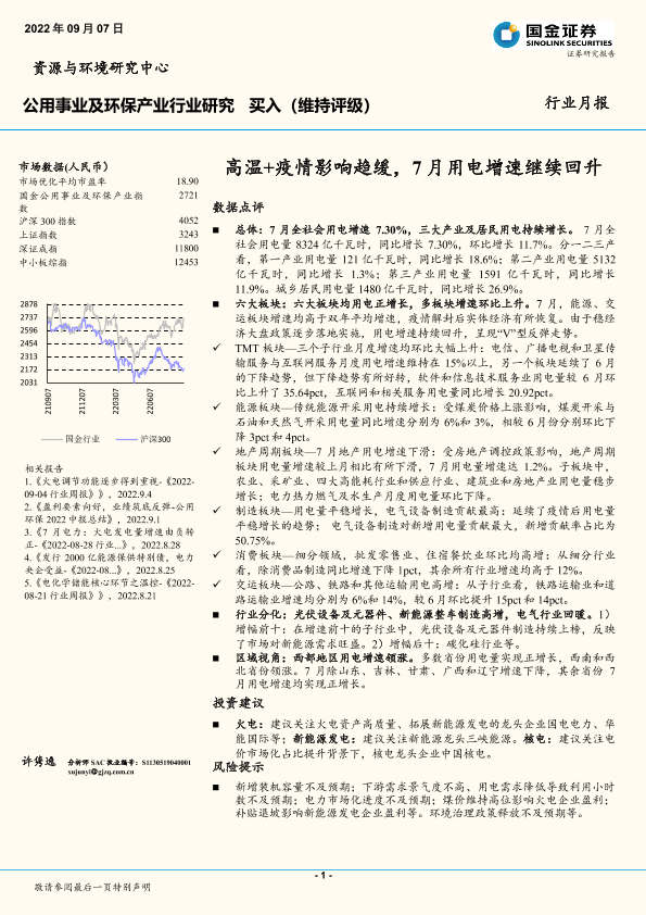 【国金证券】【20220907】公用事业及环保产业行业研究:高温+疫情影响趋缓,7月用电增速继续回升-17页
