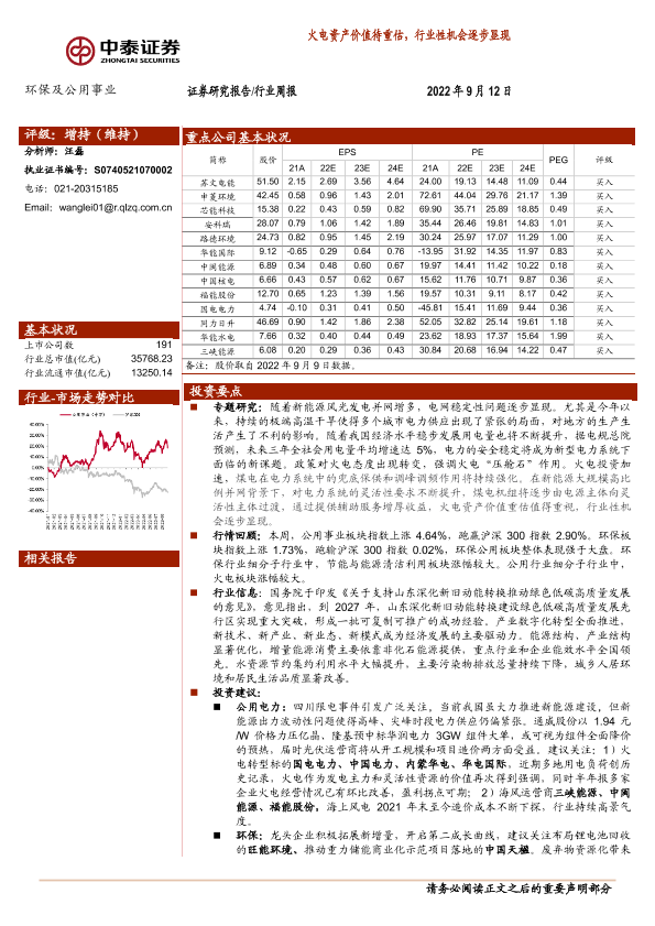 【中泰证券】【20220912】环保及公用事业行业周报:火电资产价值待重估,行业性机会逐步显现-20页
