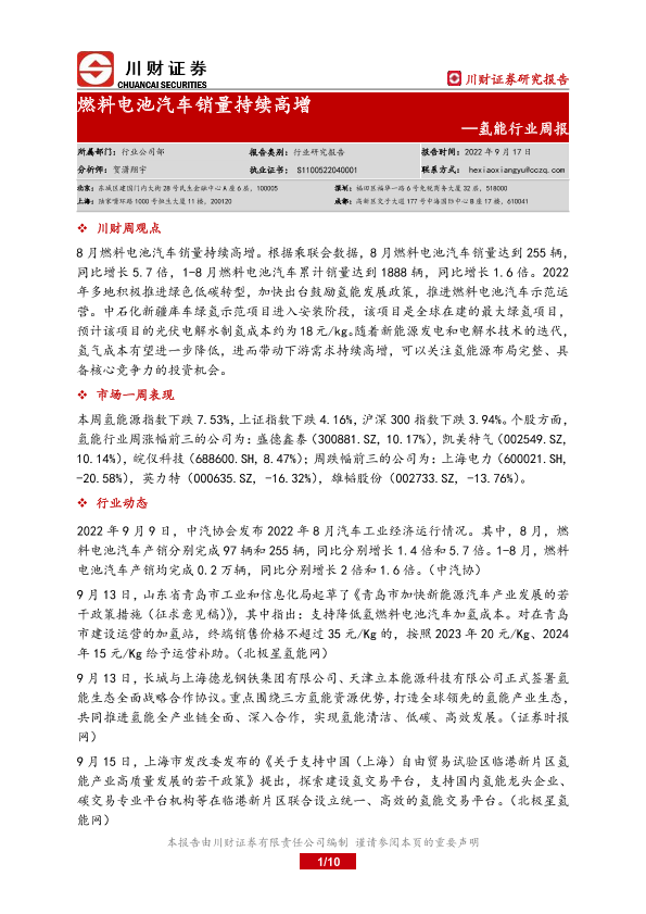 【川财证券】【20220917】氢能行业周报:燃料电池汽车销量持续高增-10页