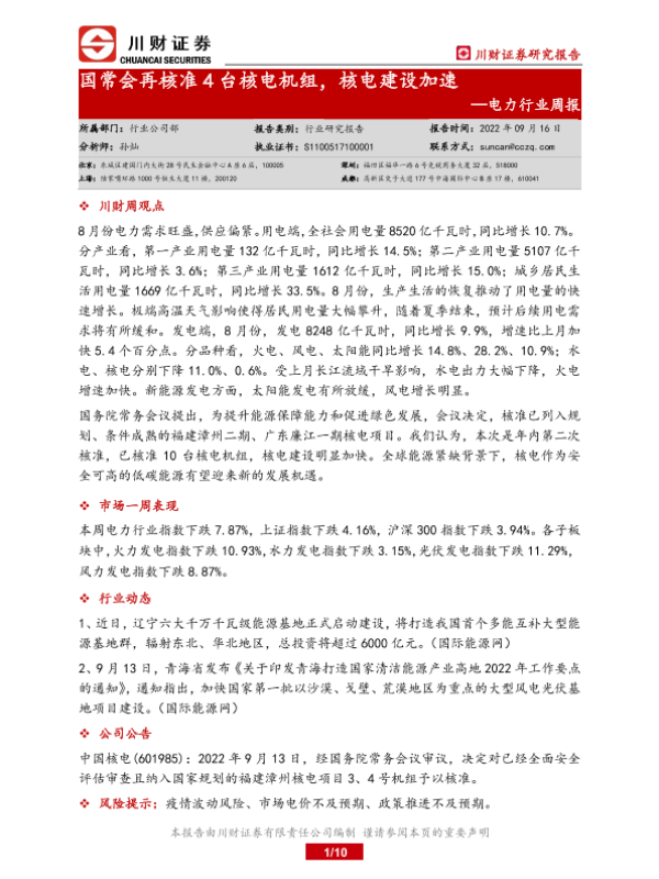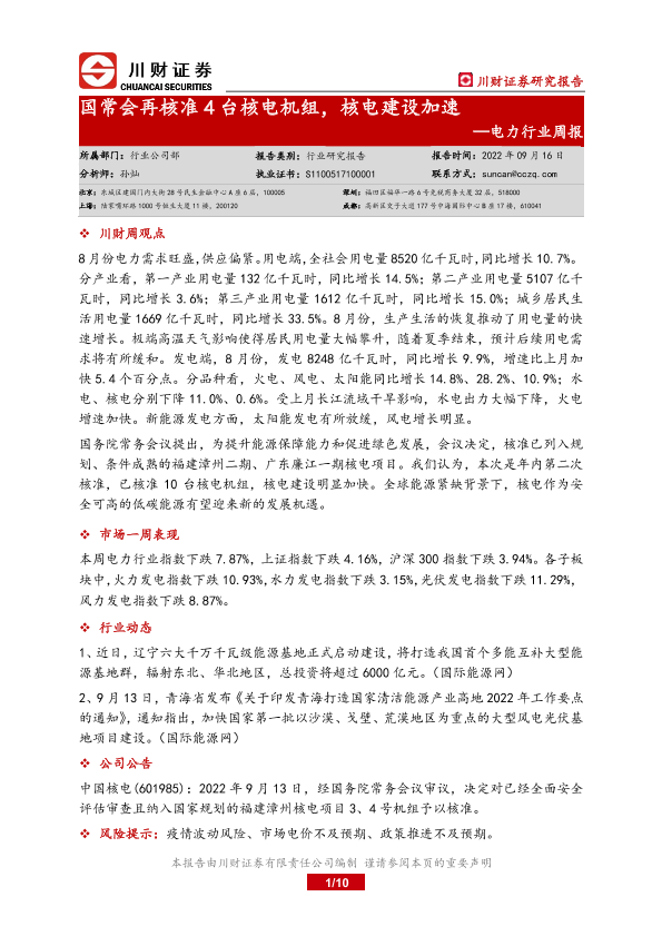 【川财证券】【20220916】电力行业周报:国常会再核准4台核电机组,核电建设加速-10页