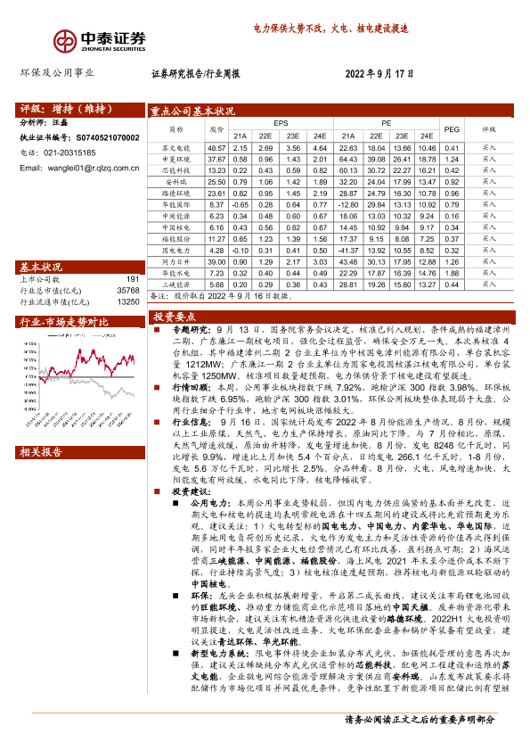 【中泰证券】【20220917】环保及公用事业行业周报:电力保供大势不改,火电、核电建设提速-20页