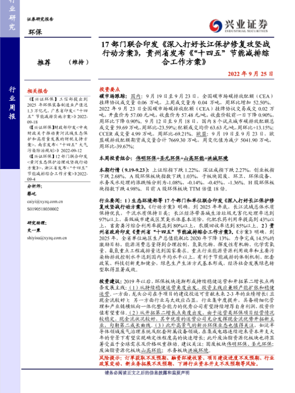 【兴业证券】【20220925】17部门联合印发《深入打好长江保护修复攻坚战行动方案》,贵州省发布《“十四五”节能减排综合工作方案》-10页