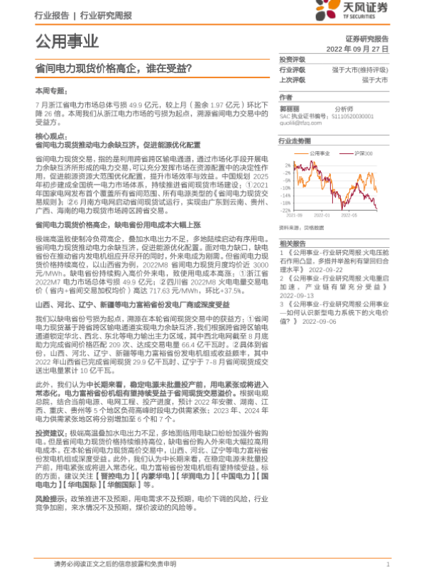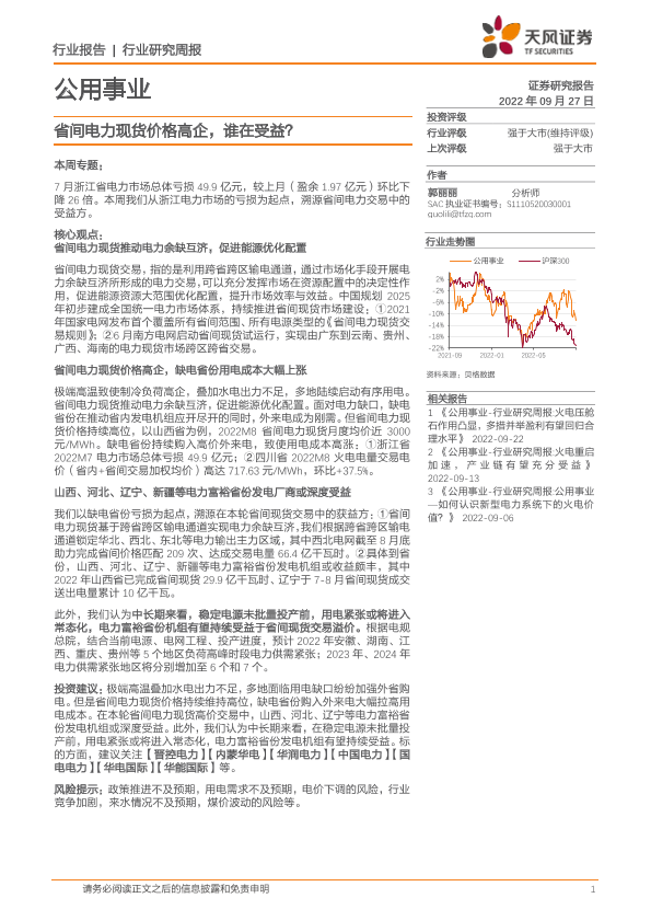 【天风证券】【20220927】公用事业行业周报:省间电力现货价格高企,谁在受益?-15页