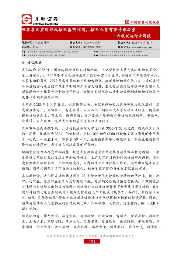 【川财证券】【20220930】科技制造行业周报:世界各国重新审视核电基荷作用,核电业务有望持续放量-13页