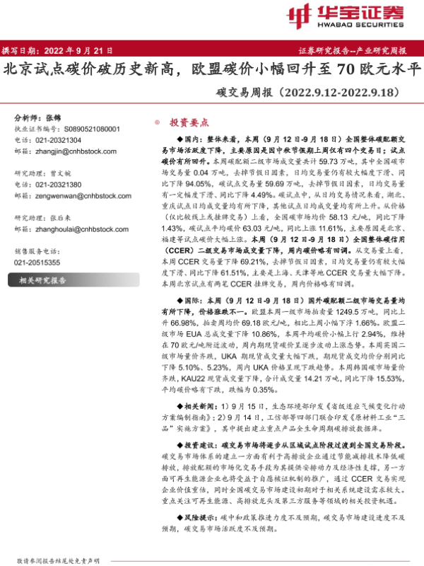 【华宝证券】【20220921】碳交易周报:北京试点碳价破历史新高,欧盟碳价小幅回升至70欧元水平-12页