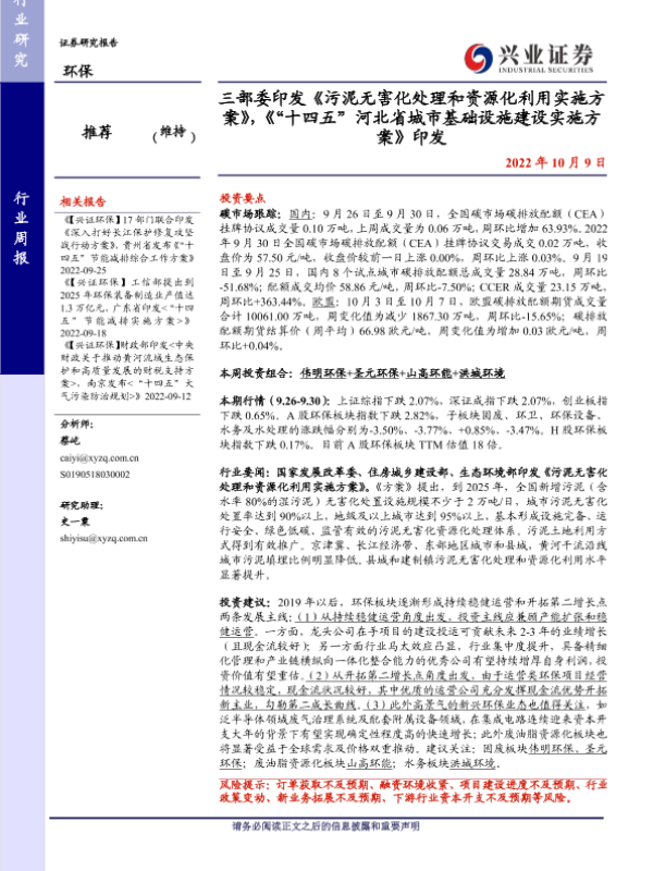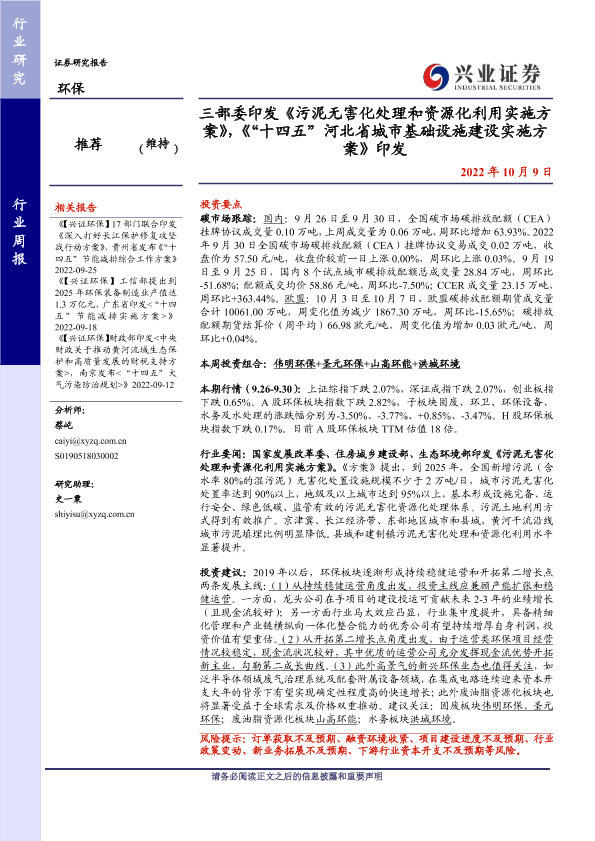 【兴业证券】【20221009】环保行业周报:三部委印发《污泥无害化处理和资源化利用实施方案》,《“十四五”河北省城市基础设施建设实施方案》印发-11页