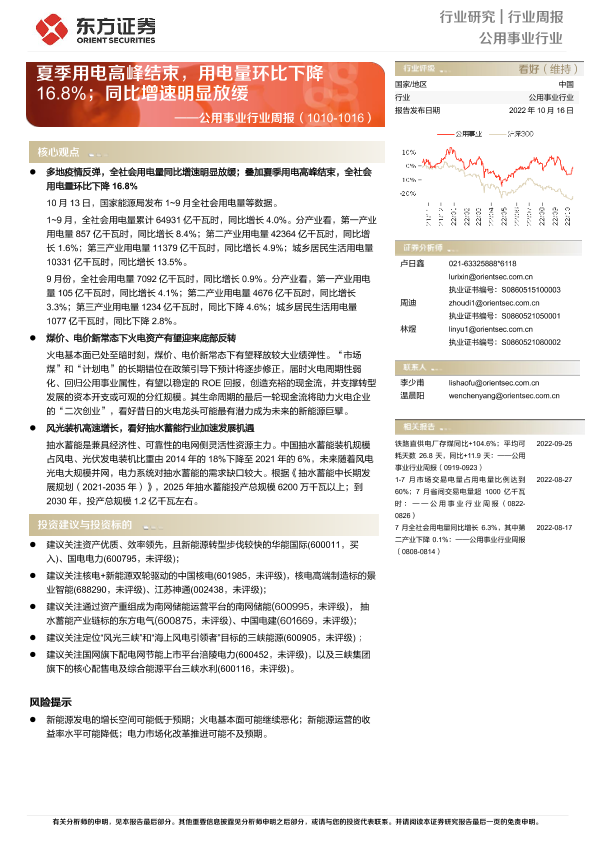 【东方证券】【20221016】公用事业行业周报:夏季用电高峰结束,用电量环比下降16.8%;同比增速明显放缓-18页