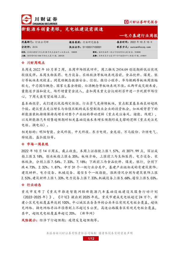 【川财证券】【20221015】电力基建行业周报:新能源车销量亮眼,充电桩建设需提速-12页