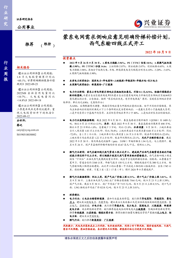 【兴业证券】【20221009】蒙东电网需求侧响应意见明确阶梯补偿计划,西气东输四线正式开工-24页
