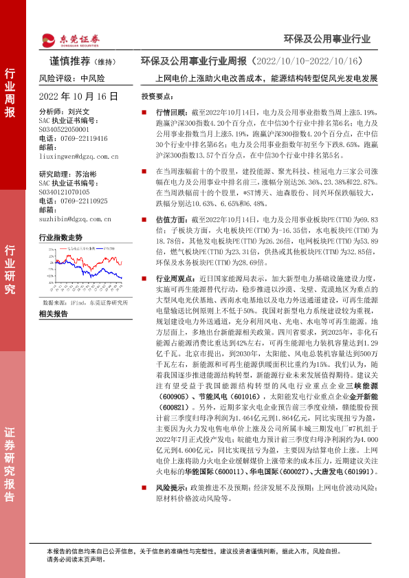 【东莞证券】【20221016】环保及公用事业行业周报:上网电价上涨助火电改善成本,能源结构转型促风光发电发展-13页