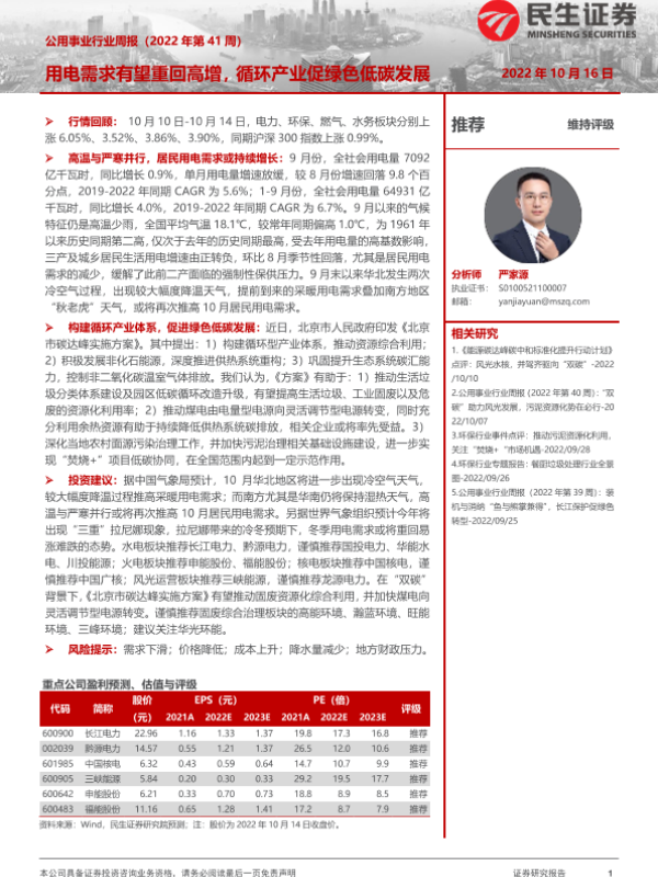 【民生证券】【20221016】公用事业行业周报:用电需求有望重回高增,循环产业促绿色低碳发展-31页