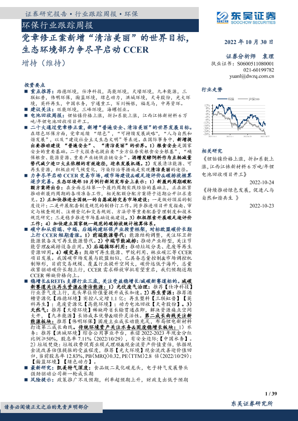 【东吴证券】【20221030】环保行业跟踪周报:党章修正案新增“清洁美丽”的世界目标,生态环境部力争尽早启动CCER-39页