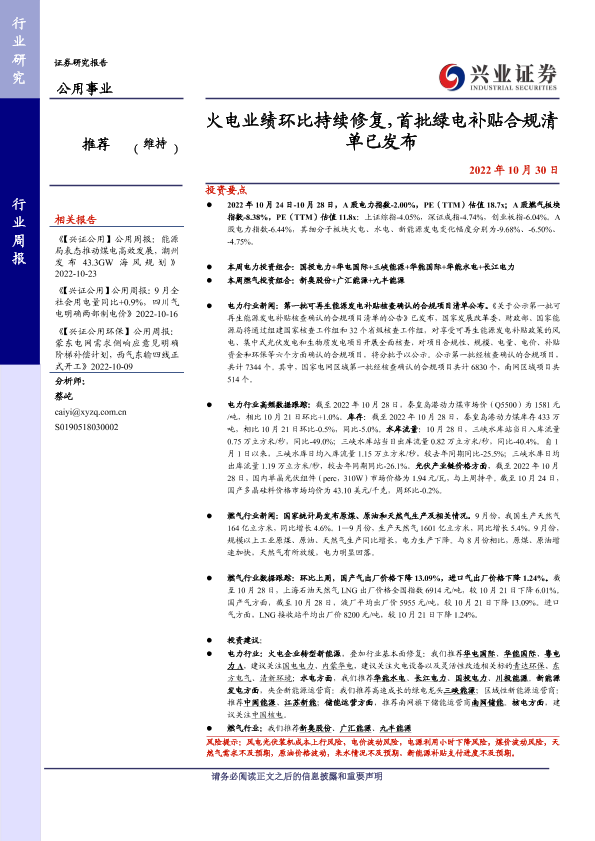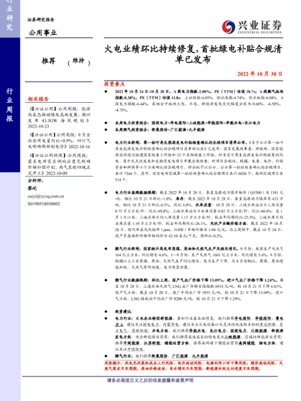 【兴业证券】【20221030】火电业绩环比持续修复,首批绿电补贴合规清单已发布-24页