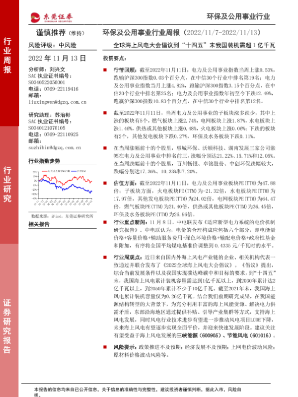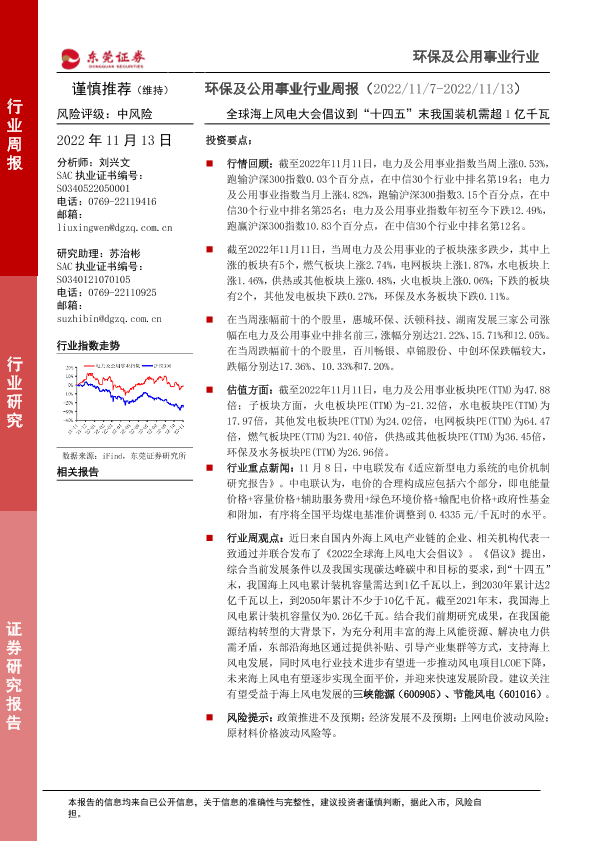 【东莞证券】【20221113】环保及公用事业行业周报:全球海上风电大会倡议到“十四五”末我国装机需超1亿千瓦-11页