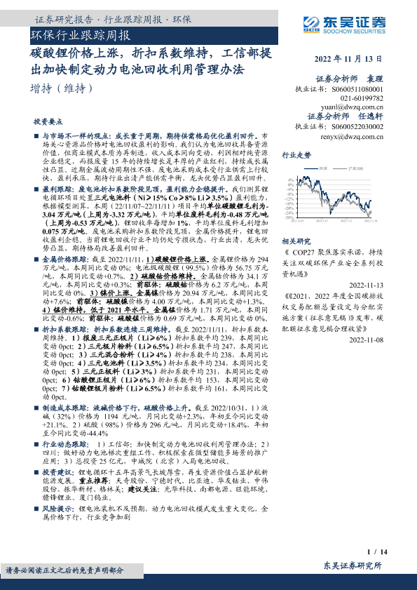 【东吴证券】【20221113】环保行业跟踪周报:碳酸锂价格上涨,折扣系数维持,工信部提出加快制定动力电池回收利用管理办法-14页