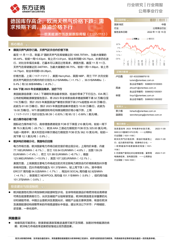 【东方证券】【20221115】公用事业行业:欧美能源市场数据跟踪周报-14页