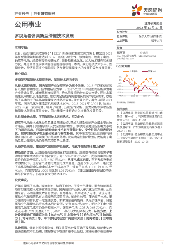 【天风证券】【20221117】公用事业行业研究周报:多视角看各类新型储能技术发展-13页