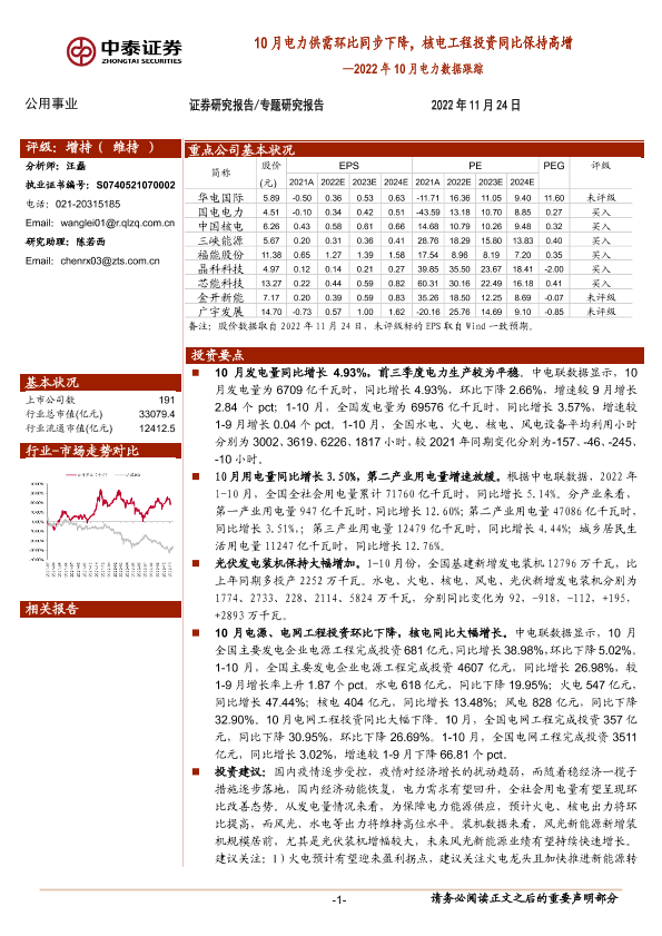 【中泰证券】【20221124】10月电力供需环比同步下降,核电工程投资同比保持高增-14页