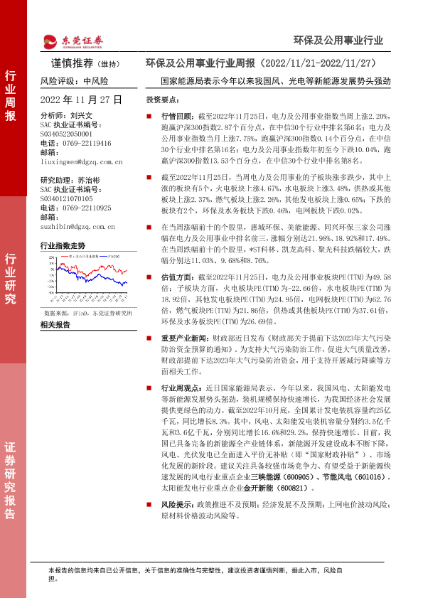 【东莞证券】【20221127】环保及公用事业行业周报:国家能源局表示今年以来我国风、光电等新能源发展势头强劲-12页