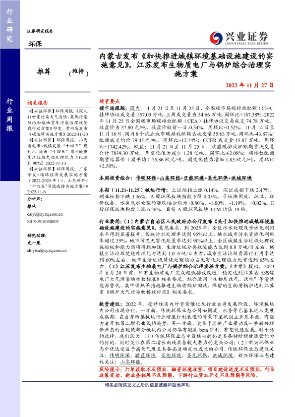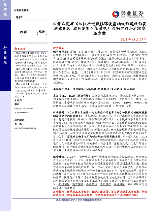 【兴业证券】【20221127】环保行业周报:内蒙古发布《加快推进城镇环境基础设施建设的实施意见》,江苏发布生物质电厂与锅炉综合治理实施方案-10页