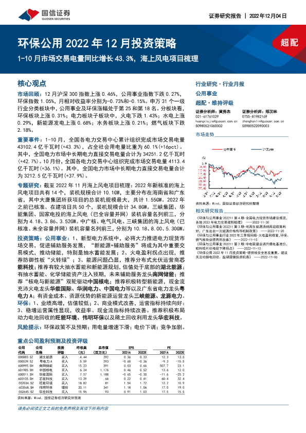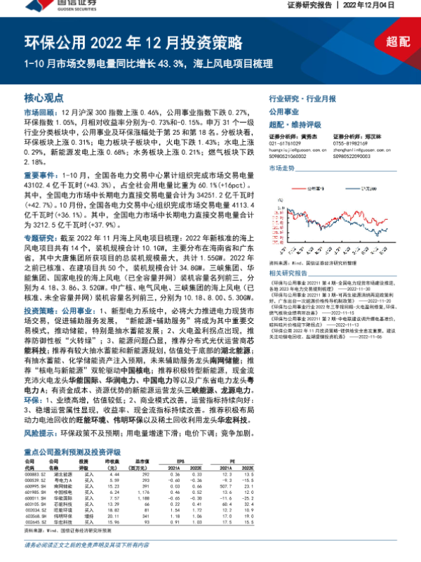 【国信证券】【20221204】2022年12月环保公用投资策略:1-10月市场交易电量同比增长43.3%,海上风电项目梳理-30页