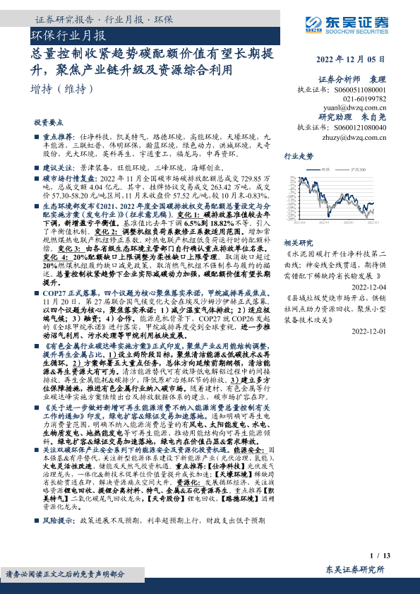 【东吴证券】【20221205】环保行业月报:总量控制收紧趋势碳配额价值有望长期提升,聚焦产业链升级及资源综合利用-13页