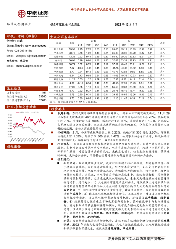 【中泰证券】【20221204】环保及公用事业行业周报:峰谷价差拉大叠加分布式光伏增长,工商业储能需求有望提振-21页