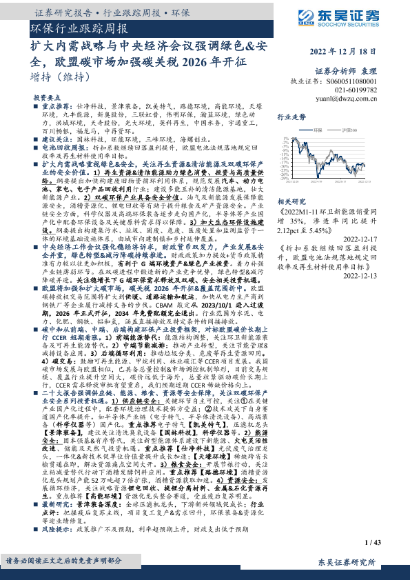 【东吴证券】【20221218】环保行业跟踪周报:扩大内需战略与中央经济会议强调绿色&安全,欧盟碳市场加强碳关税2026年开征-43页