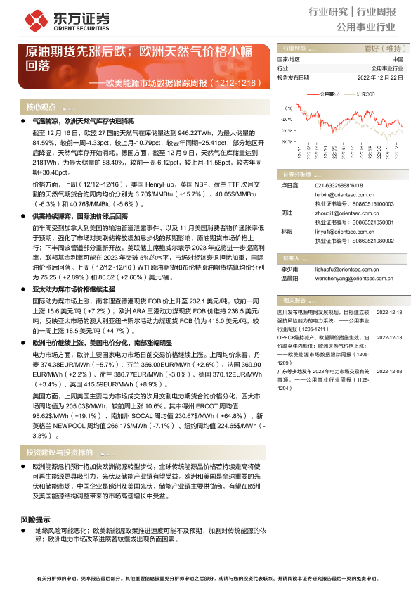 【东方证券】【20221222】欧美能源市场数据跟踪周报:原油期货先涨后跌;欧洲天然气价格小幅回落-14页