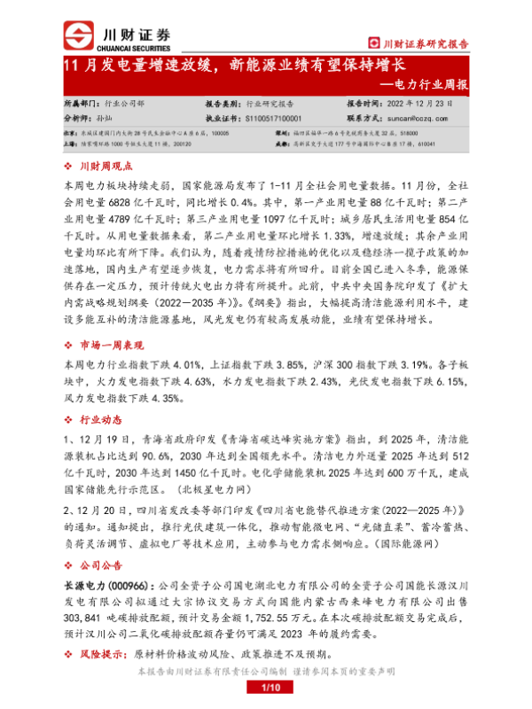 【川财证券】【20221223】11月发电量增速放缓,新能源业绩有望保持增长-10页