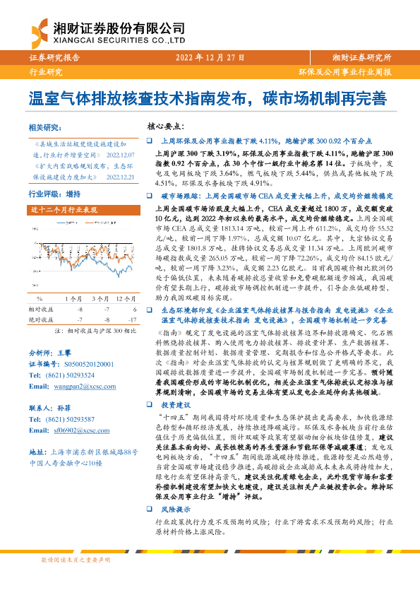 【湘财证券】【20221227】环保及公用事业行业周报:温室气体排放核查技术指南发布,碳市场机制再完善-10页