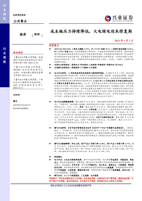 【兴业证券】【20230102】公用事业行业周报:成本端压力持续降低,火电绿电迎来修复期-24页