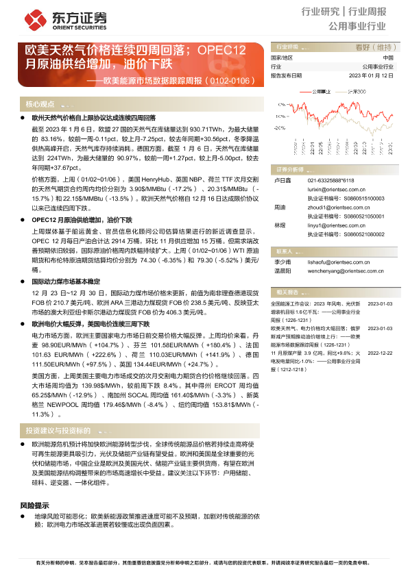 【东方证券】【20230112】公用事业行业行业周报:欧美能源市场数据跟踪周报-13页