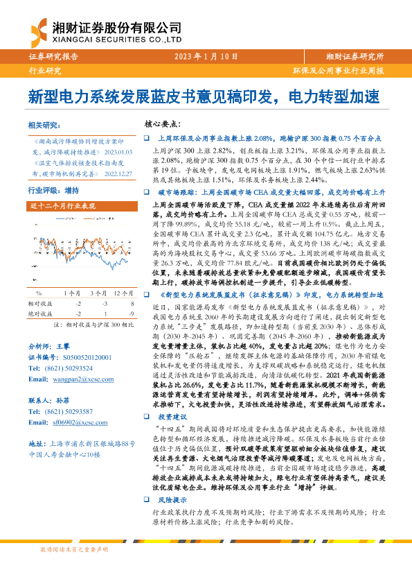 【湘财证券】【20230110】环保及公用事业行业周报:新型电力系统发展蓝皮书意见稿印发,电力转型加速-11页