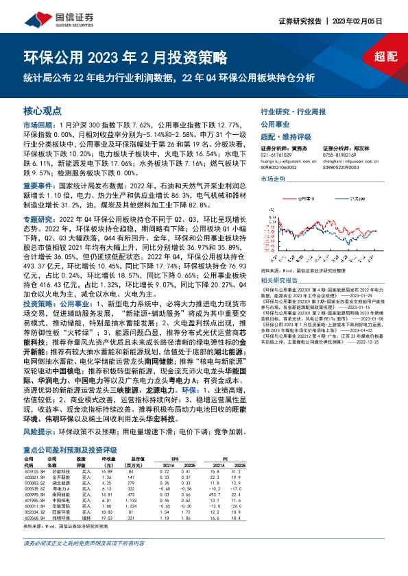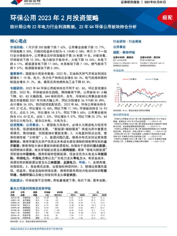 2023年2月 投资策略 持仓分析 环保公用 电力行业