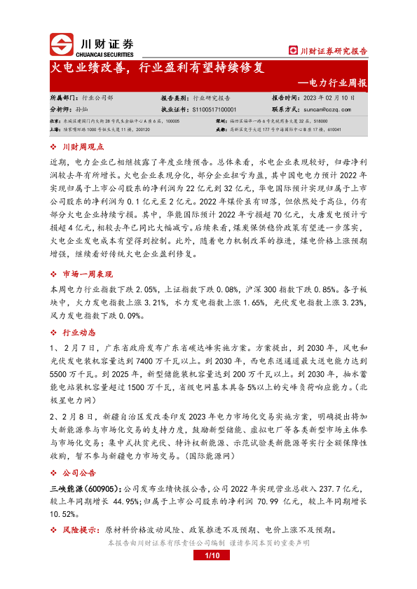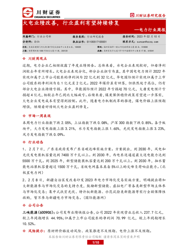 【川财证券】【20230210】电力行业周报:火电业绩改善,行业盈利有望持续修复-10页