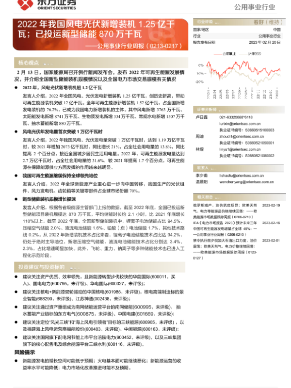 【东方证券】【20230220】2022年我国风电光伏新增装机1.25亿千瓦;已投运新型储能870万千瓦-14页