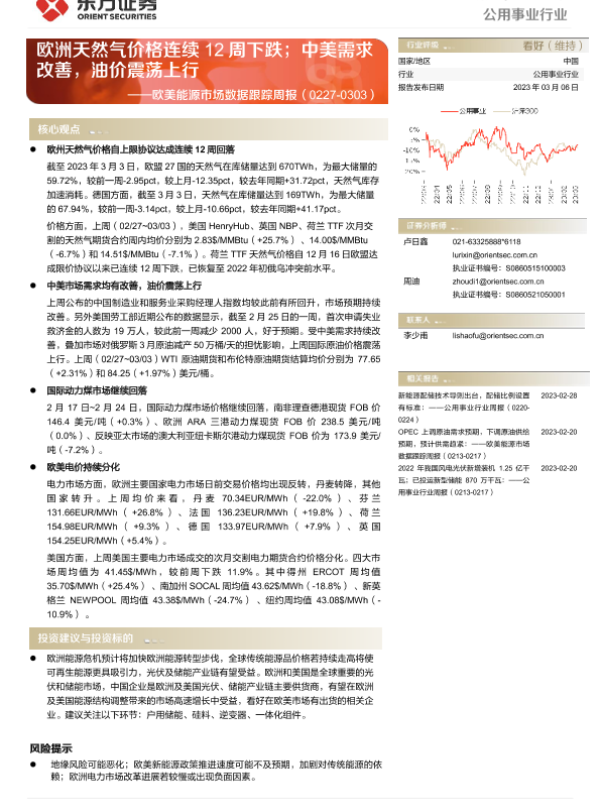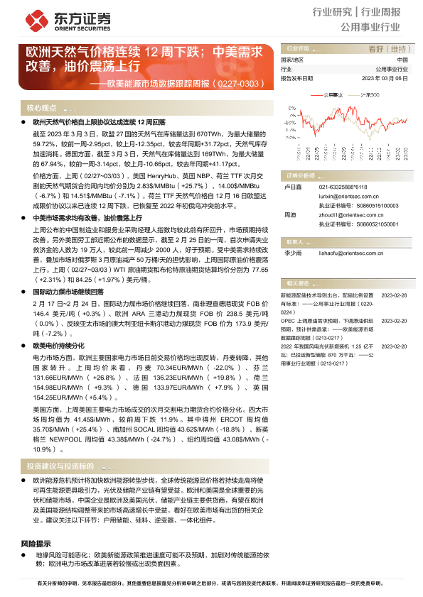 【东方证券】【20230306】欧美能源市场数据跟踪周报:欧洲天然气价格连续12周下跌;中美需求改善,油价震荡上行-13页