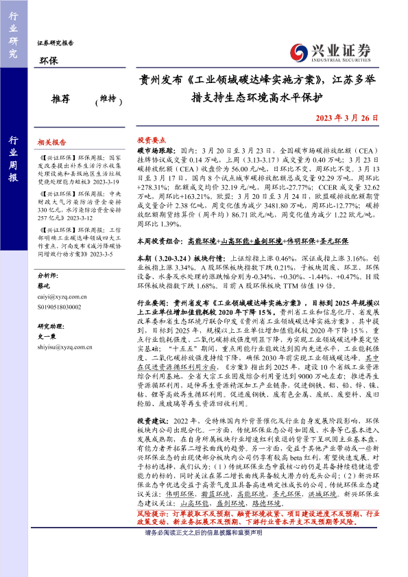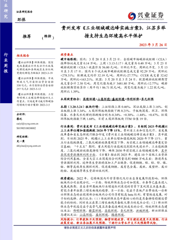 【兴业证券】【20230326】环保行业周报:贵州发布《工业领域碳达峰实施方案》,江苏多举措支持生态环境高水平保护-12页