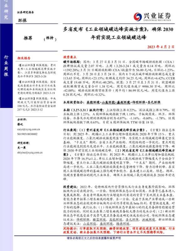 【兴业证券】【20230402】环保行业周报:多省发布《工业领域碳达峰实施方案》,确保2030年前实现工业领域碳达峰-11页