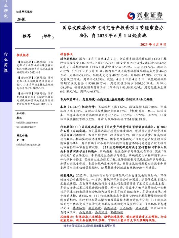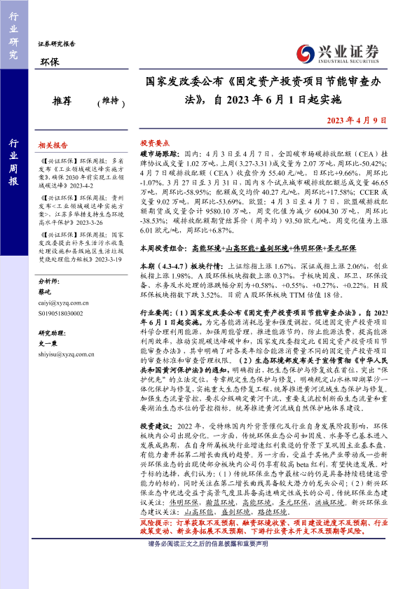 【兴业证券】【20230409】环保行业周报:国家发改委公布《固定资产投资项目节能审查办法》-10页