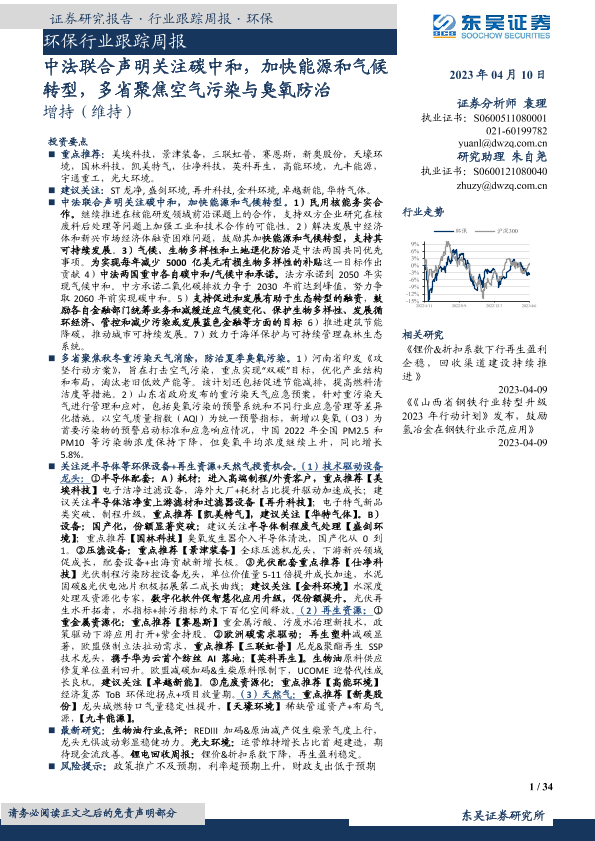 【东吴证券】【20230410】环保行业跟踪周报:中法联合声明关注碳中和,加快能源和气候转型,多省聚焦空气污染与臭氧防治-34页