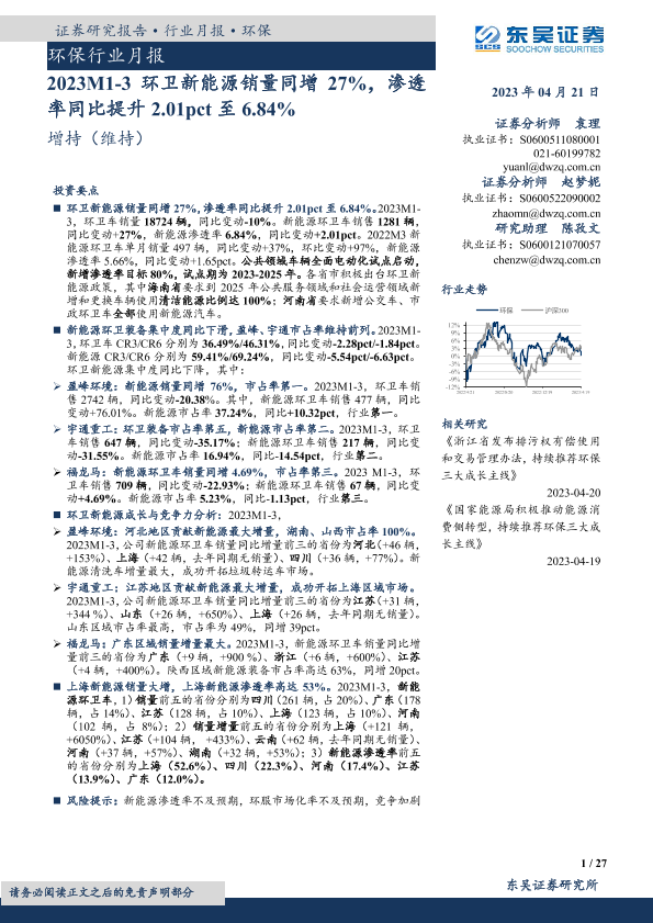 【东吴证券】【20230421】2023M1-3环卫新能源销量同增27%,渗透率同比提升2.01pct至6.84%-27页