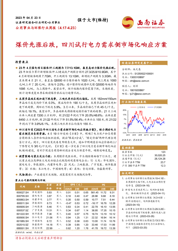 【西南证券】【20230423】公用事业与环保行业周报:煤价先涨后跌,四川试行电力需求侧市场化响应方案-21页