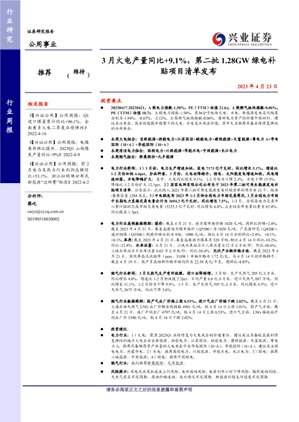 【兴业证券】【20230423】3月火电产量同比+9.1%,第二批1.28GW绿电补贴项目清单发布-25页