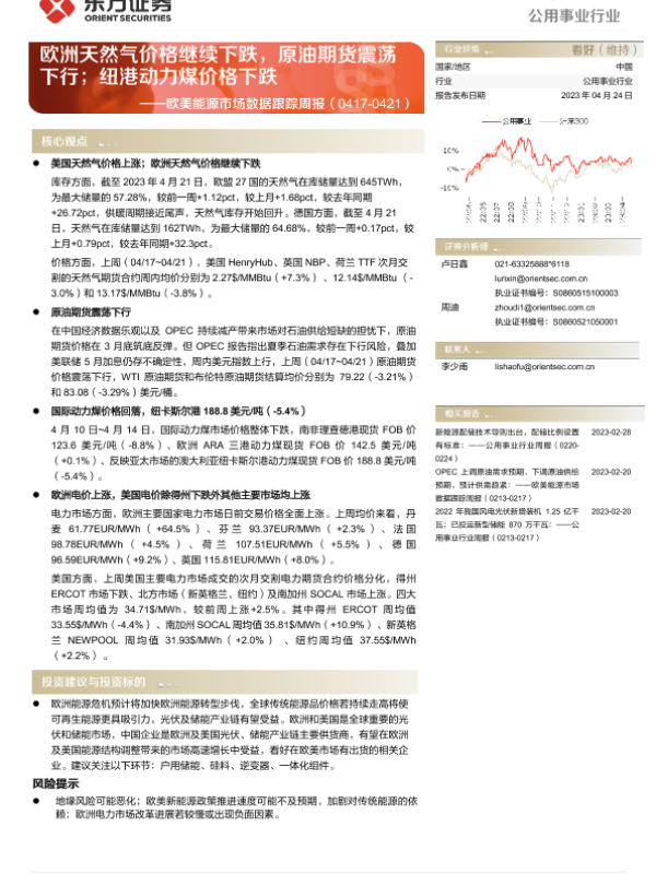 【东方证券】【20230424】欧美能源市场数据跟踪周报:欧洲天然气价格继续下跌,原油期货震荡下行;纽港动力煤价格下跌-14页