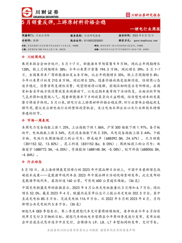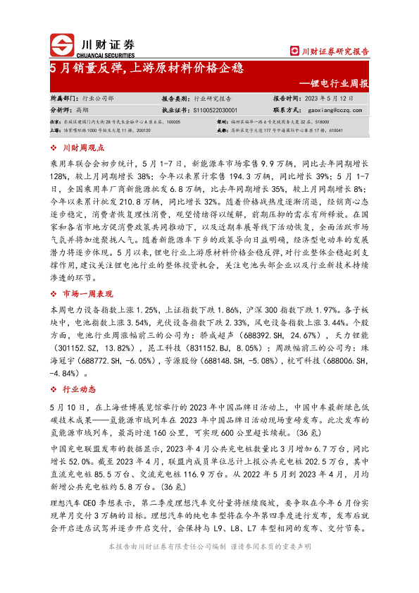 【川财证券】【20230512】5月销量反弹,上游原材料价格企稳-10页