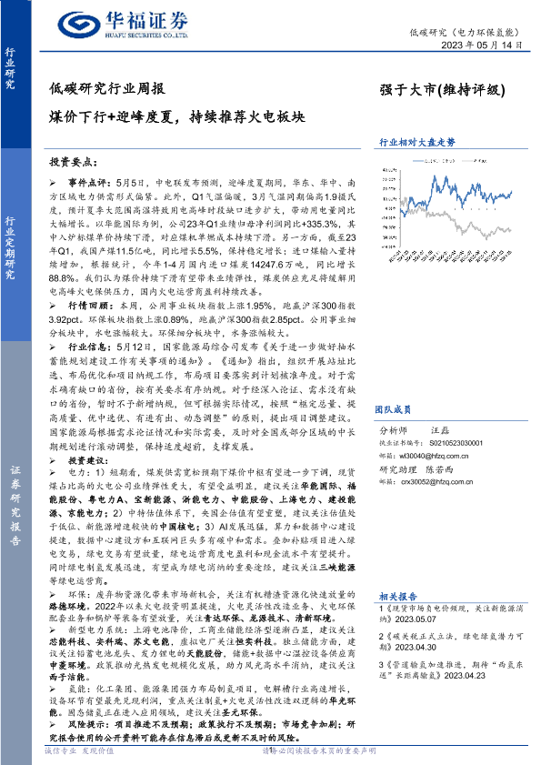 【华福证券】【20230514】低碳研究行业周报:煤价下行+迎峰度夏,持续推荐火电板块-13页